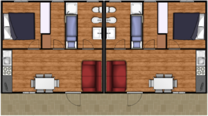 Bungalow Large next to each other, that can host up to 6 people each. The Bungalow has a room with a king-size bed, a bedroom with a bunk bed, a bathroom with shower, a small kitchen and a living room with a sofa bed.