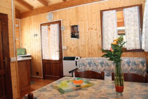 Wooden Bungalow that can host up to 6 people. It is suitable for elderly or disabled people. It has a room with a king-size bed, a bedroom with bunk beds, a bathroom with shower, a kitchen and a living room with a sofa bed.