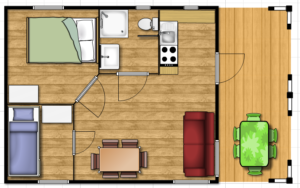 Wooden Bungalow that can host up to 6 people. It is suitable for elderly or disabled people. It has a room with a king-size bed, a bedroom with bunk beds, a bathroom with shower, a kitchen and a living room with a sofa bed.