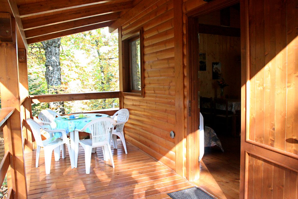 Bungalow in legno per 4/6 persone, con acqua calda corrente, doccia, stanza matrimoniale, stanza con letti a castello, cucina soggiorno, bagno, terrazzino privato coperto e divano letto zona soggiorno.