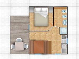 Bungalow in legno dai 16 ai 20 mq. Per 2 persone, con acqua calda e doccia, stanza matrimoniale, cucina soggiorno, bagno.