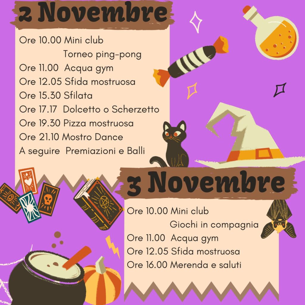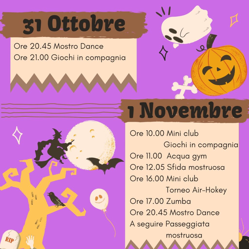 Actividades: Baile de monstruos, juegos en compañía, torneos deportivos, zumba y aquagym, truco o trato, cena en compañía, desfile monstruoso y concurso de tallado de calabazas.